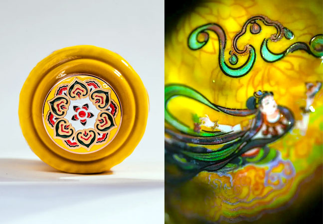 “散花飞天”是敦煌壁画系列中唐代飞天的代表,鲜花环绕飞天仙女四周,有着吉祥、幸福、美好的祝福寓意。