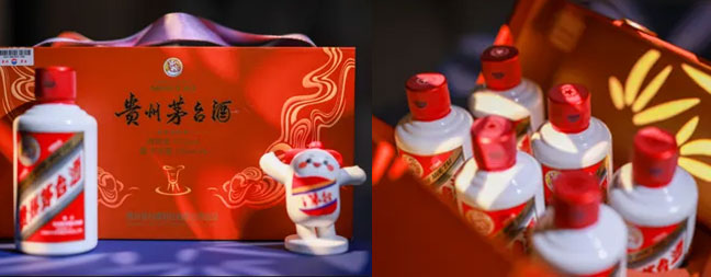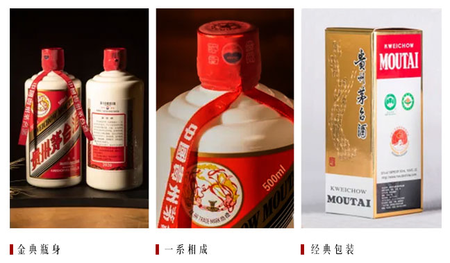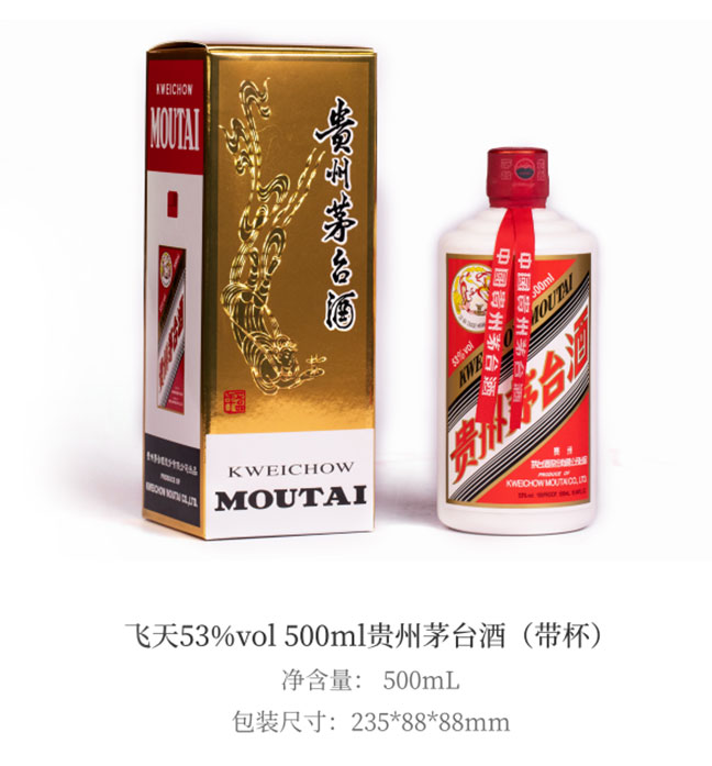 53%vol500ml贵州茅台酒(经典)为顶翻式彩盒包装,整体以金色为主,黑、白、红为辅。盒身以飞天仙女为主要元素,盒内配置透明玻璃酒杯、说明书。酒瓶采用乳白色玻璃材质,贴标为茅台经典斜杠设计,背标主要为茅台酒文字介绍。瓶盖配套采用了具备防伪功能的红色热缩胶帽,并搭配红色丝带。