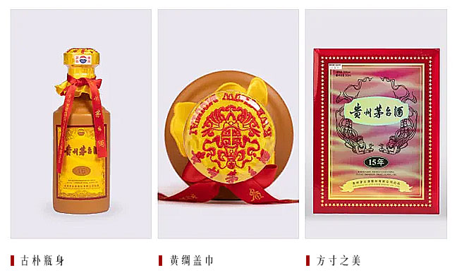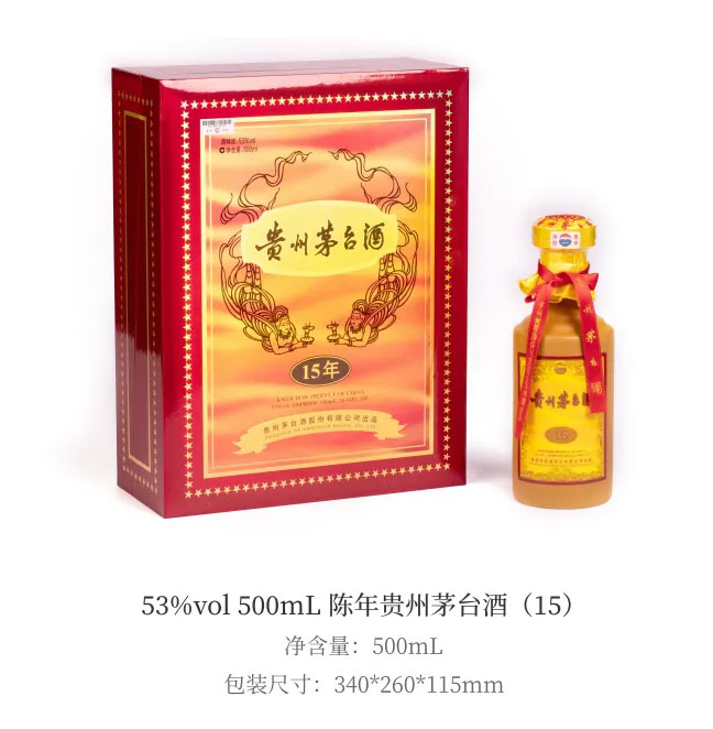 53%vol500ml陈年贵州茅台酒(15)采用上翻式礼盒包装,盒内配置青铜酒樽及说明书。酒瓶为紫砂陶瓷材质,搭配黄色盖巾及红色丝带,酒标采用钞票凹版印刷技术,触摸有肌理感,其中“贵州茅台酒”字样采用凹印防伪,“15”字样采用凹印潜影,用放大镜识别可见“MOUTAI”潜影字样,且迎光斜倾转动由“15”变为“茅台”字样。
