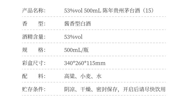 产自贵州茅台酒地理标志保护核心产区,利用得天独厚的自然环境,以本地优质糯高粱、小麦、水为原料,采用科学独特的贵州茅台酒传统工艺精心酿制,以15年及以上酒龄基酒多次精心勾兑而成,勾兑过程采用“酒勾酒”勾兑方式,撷取1000余支·基酒精华,产品具有酱香突出、幽雅细腻、酒体醇厚、柔和丰满、老熟味明显、回味悠长,空杯留香持久的典型特点。 备注:① 支:是茅台酒勾兑基酒的最小单元。